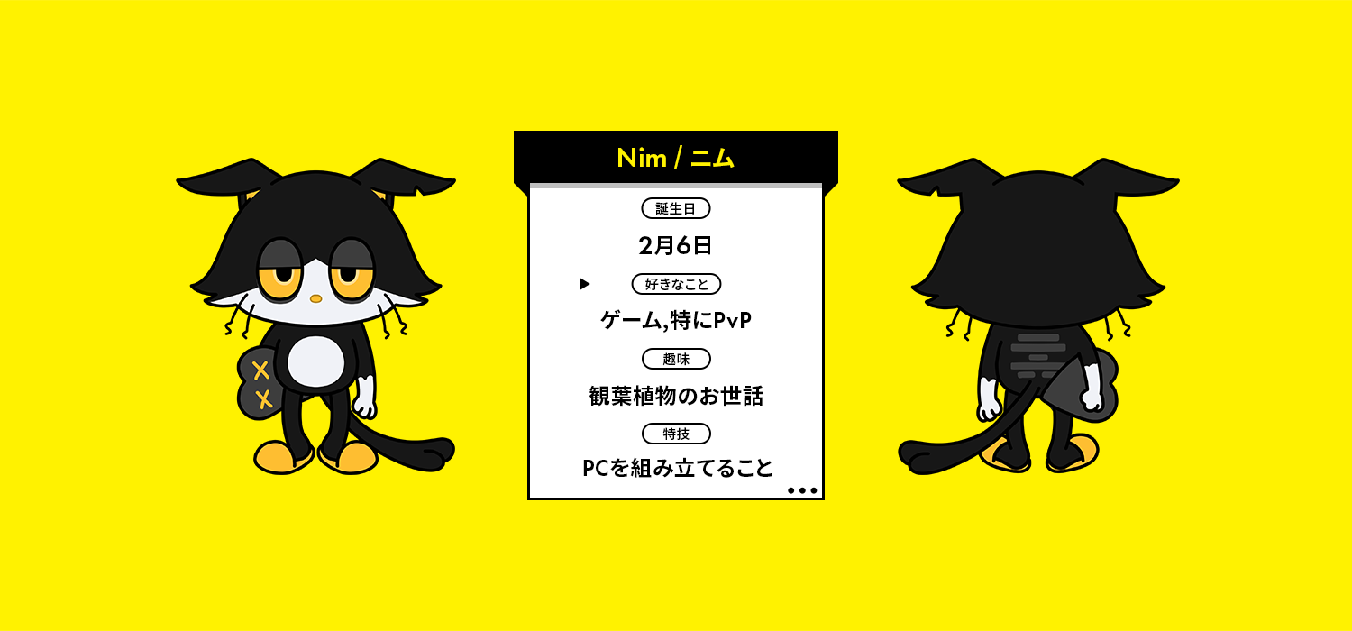 2月6日にデビューしたFUTAROKU公式キャラクターのNim/ニム。ゲームが大好きな夜行性のNim。日中は趣味の観葉植物のお世話をしたりしてのんびり過ごし、26:00以降は大好きなゲームを朝までプレイ!